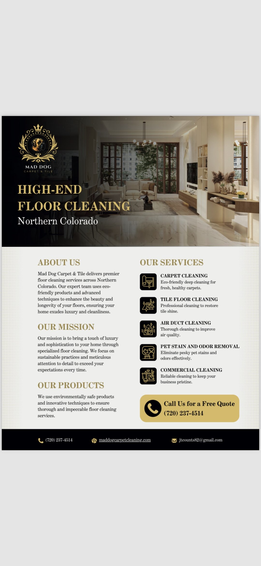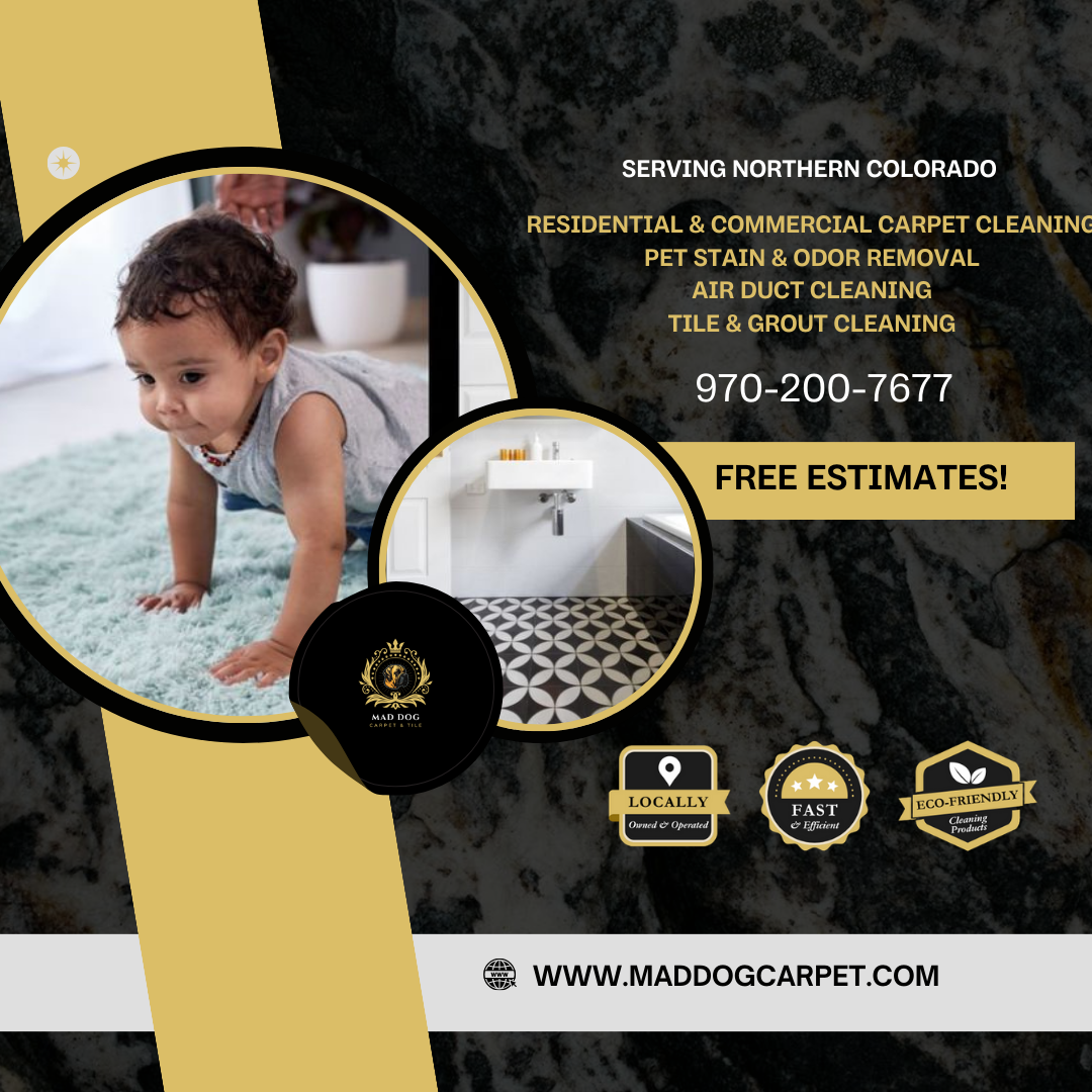 "Mad Dog Carpet and Tile Cleaning is your trusted partner for top-notch carpet cleaning in Loveland, CO, serving all of Larimer County. We specialize in a wide range of services, including professional carpet cleaning, thorough air duct cleaning, expert upholstery cleaning, and reliable water damage restoration. Our team uses state-of-the-art equipment and eco-friendly solutions to ensure your home or business is clean, fresh, and free of allergens. Whether you need a deep clean for your carpets, a refresh for your air ducts, or urgent water damage restoration, Mad Dog Carpet and Tile Cleaning is here to deliver exceptional results. Contact us today to schedule your service and experience the difference of a truly clean space!"